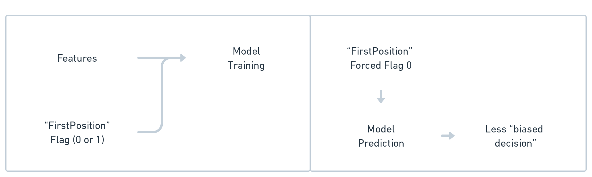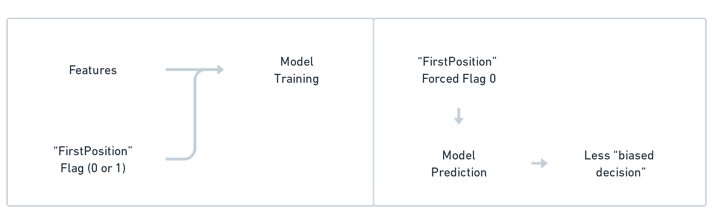 A straightforward approach to overcome this is that you may gather the data of your model (features and label) and create an additional feature to each instance indicating if your label (click or no-click) happened when it was the first in the order or not. After training our model on that data, we can, for a given instance, force the flag 0 (not first). This way, we remove some of the bias of the cases always in the first position. See this flow below: